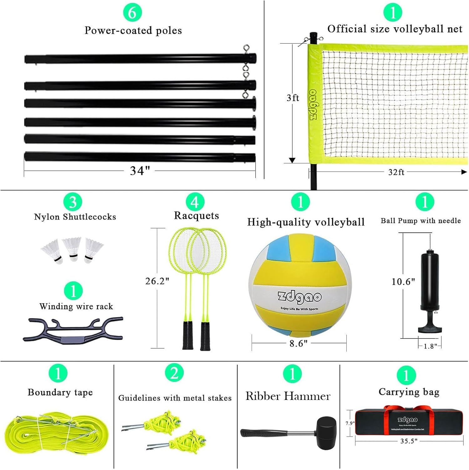 π Outdoor Volleyball and badminton combo set, Accessories are all included: 6-pieces poles, 4 one-piece badminton rackets, 1 soft volleyball ball and ball pump, 2 guideline with stakes, 1 regulation size volleyball net with ties, 1 boundary line, 3 nylon shuttlecocks.